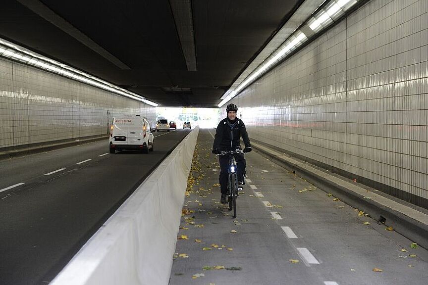Welchen Sinn die Bemalung der kleinen Trennwand macht und warum man nicht eher die Tunnelwand zur Verschönerung auserkoren hat, erschließt sich uns nicht wirklich, auch erscheint die Dauer der Maßnahme etwas sehr lang und die Umleitung ist sehr unattraktiv und nicht steigungsarm. Furchtlose Radfahrer sollten jedoch auch die verbleibende Fahrspur im Tunnel mit dem Autoverkehr gemeinsam nutzen können.