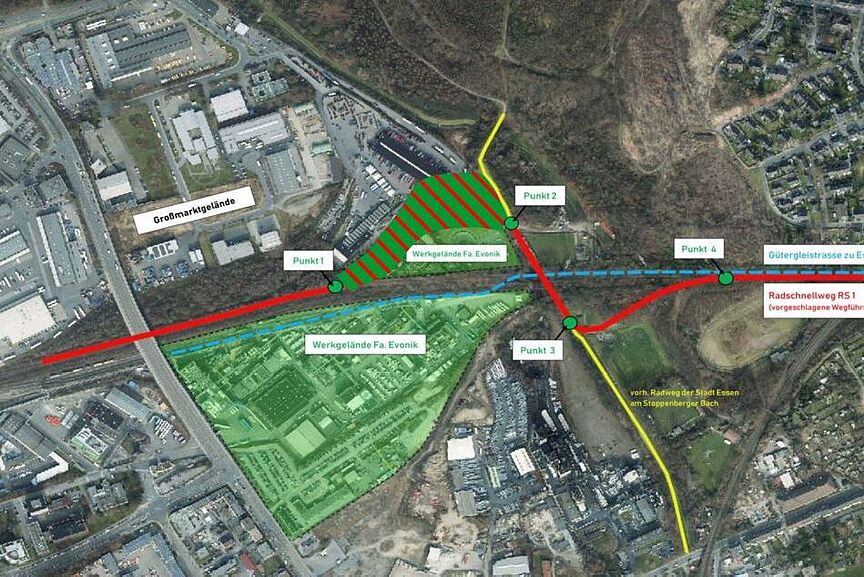 Dabei handelt es sich unter anderem um die Berücksichtigung der Sicherheitsanforderungen der angrenzenden Firma Evonik Industries und um Konflikte der geplanten Trassierung des RS 1 mit bahnbetrieblich notwendigen Gleisen und Oberleitungen der Deutschen Bahn AG.