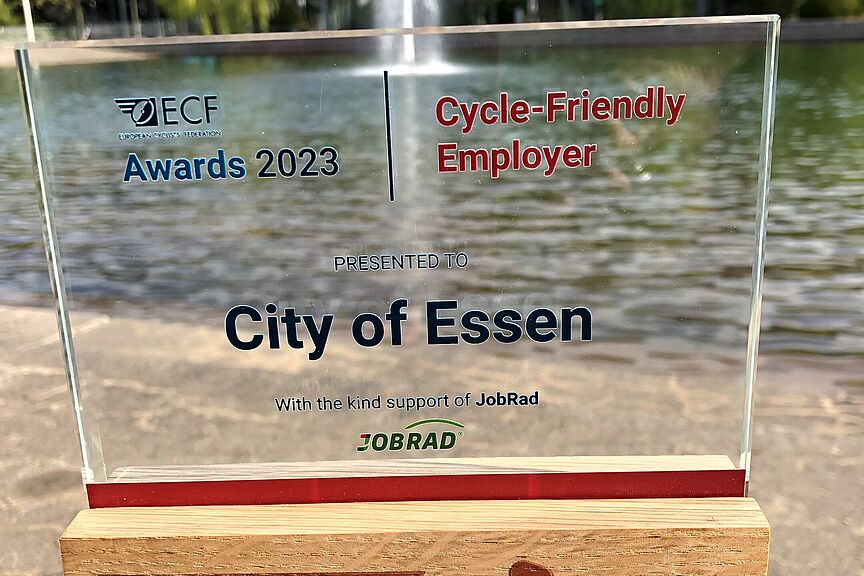 In diesem Jahr wurde die Stadt Essen von der ECF mit einem Preis für das Projekt "Fahrradfreundlicher Arbeitgeber" ausgezeichnet. Bereits im Jahr 2014 formulierte die Stadt Essen das Ziel, den Modal-Split bis 2035 auf jeweils 25 Prozent für den ÖPNV, motorisierten Individualverkehr, Fuß- und Radverkehr zu entwickeln. Seitdem haben sich zahlreiche Essener Unternehmen, Firmen, Verbände und Organisationen zum Ziel gesetzt, ihren Beitrag zur Mobilitätswende zu leisten und auch die Fahrradfreundlichkeit in den Fokus zu rücken. Eine wichtige Maßnahme ist in dem Zusammenhang das EU-weite Siegel "Zertifizierter Fahrradfreundlicher Arbeitgeber", das in Deutschland exklusiv vom Allgemeinen Deutschen Fahrrad-Club (ADFC) vergeben wird. Dabei haben die Europäische Union und der ADFC einheitliche Kriterien festgelegt, die Unternehmen helfen sollen, das EU-Zertifikat in den Abstufungen Gold, Silber und Bronze zu erreichen.