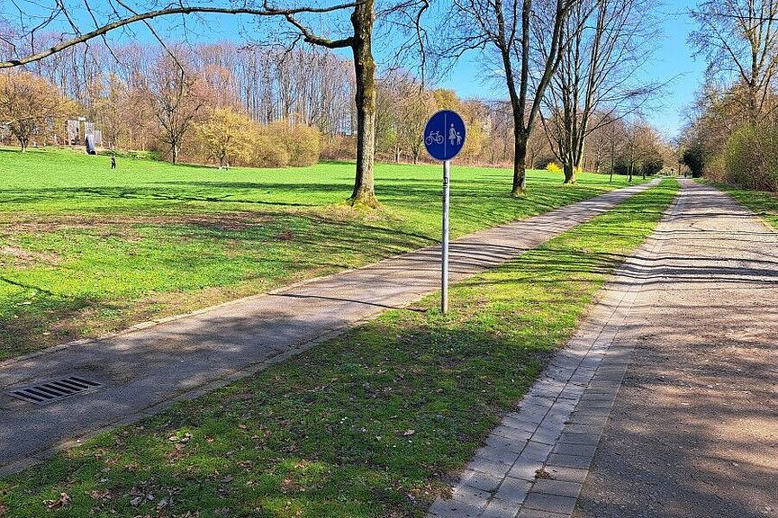 Auf dem derzeit von Fußgängerinnen*Fußgängern genutzten Weg, der wegen der größeren Breite zusätzlich von Pflegefahrzeugen genutzt wird, besteht aufgrund seines Alters Erneuerungsbedarf. Im Zuge der jetzt beginnenden Instandsetzungsarbeiten wird eine Nutzungsänderung vorgenommen. Der drei Meter breite Weg soll zukünftig als Radweg genutzt und ausgeschildert werden, während der zwei Meter breite Weg als Fußweg genutzt und ausgeschildert werden soll. Die wassergebundene Decke des drei Meter breiten zukünftigen Radweges wird durch eine asphaltierte Decke ausgetauscht. Damit wird der Radweg dann auch allwettertauglich sein und einen maschinellen Winterdienst zulassen. Eine ganzjährige Nutzbarkeit wird so ermöglicht. Insgesamt wird durch die Umsetzung der Maßnahme auch eine Erhöhung der Verkehrssicherheit erreicht.