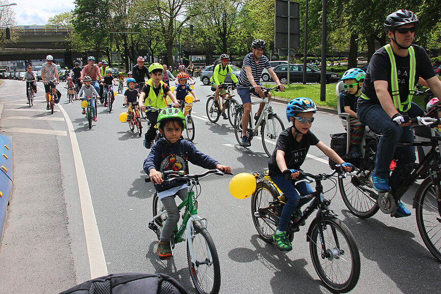 Mitradelnde Kinder, Eltern und Großeltern wollen zeigen, was ihnen am Herzen liegt: eine kindgerechte Radinfrastruktur in Essen. Eine, in der Kinder jeden Alters sicher und selbstständig unterwegs sein können. Egal, ob noch in Begleitung auf dem Bürgersteig oder alleine auf dem Weg zur Schule oder zu Freund*innen.
