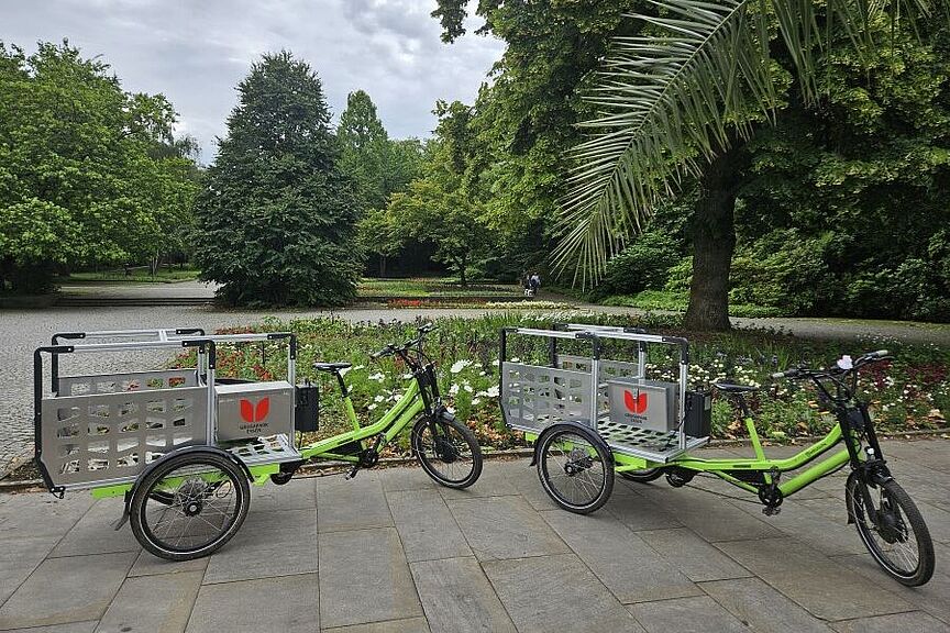 Die Mitarbeiter*innen können damit Arbeitsmaterialien leichter transportieren und Wegstrecken innerhalb des Parks und auf den Friedhöfen ohne Kraftfahrzeug zurücklegen. Dies ist auch für die zahlreichen Besucher*innen ein Gewinn, da die Verwendung der Lastenräder einen störungsfreien Aufenthalt ermöglicht.