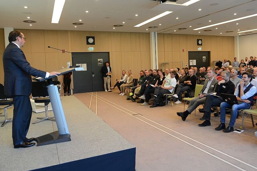 Rund 120 interessierte Bürger*innen waren der Einladung ins Atlantik Congress Hotel an der Messe Essen gefolgt und nutzten die Gelegenheit, ihre Sicht auf die aktuelle Situation zur Umsetzung der Ziele mit den Verantwortlichen engagiert zu diskutieren. "Mir ist wichtig, diesen Dialog gemeinsam zu führen", betonte Oberbürgermeister Thomas Kufen zum Auftakt. „Bringen Sie Ihre Expertise, Ihr Fachwissen, Ihre Motivation mit ein – wir sind eine lernende Verwaltung“, ermunterte Oberbürgermeister Kufen die Anwesenden. Der informative und kritische Blick auf eine Fahrradstadt Essen war die erste Dialogveranstaltung im Rahmen des Essener RadEntscheids – gestartet als Bürgerbegehren 2019 und 2020 als Ratsbeschluss mit allen aufgestellten Zielen übernommen und verabschiedet - und somit Auftrag für die Verwaltung.