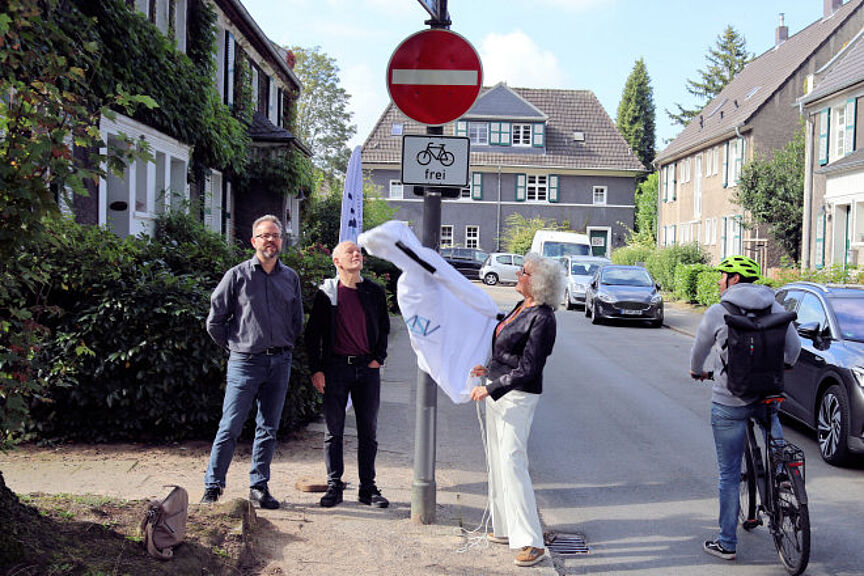Bezirksbürgermeisterin Doris Eisenmenger (Stadtbezirk III) nahm am Montag um 11 Uhr gemeinsam mit dem Projektsteuerer RadEntscheid Richard Heiker (Amt für Straßen und Verkehr der Stadt Essen) am Giebelplatz auf der Margarethenhöhe die Öffnung der beiden Einbahnstraßen vor. Wolfgang Jägemann von der Initiative RadEntscheid begleitete die Einbahnstraßenöffnung.
