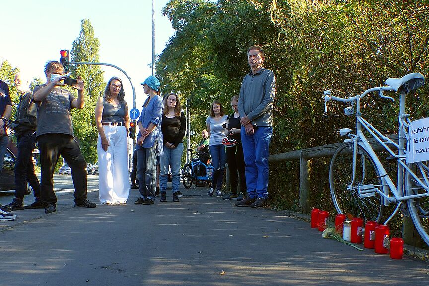 Aktive von ADFC, Radentscheid und Velo-City Ruhr organisierten drei Tage nach dem Unfall zum Gedenken an den getöteten Radfahrer die Aufstellung eines Ghost-Bikes. An dieser Veranstaltung, die mit einer Schweigeminute und einer gemeinsamen Vorbeifahrt am Unglücksort endete, nahmen etwa 40 Radlerinnen und Radler teil. Auch die Polizei war zugegen, da die Gedenkveranstaltung offiziell angemeldet war, zeigte sich zunächst allerdings sehr unkooperativ. So wurde den Teilnehmer*innen der unmittelbare Zugang zum Unfallort bzw. zum Ghost-Bike verwehrt, sie mussten auf der gegenüberliegenden Straßenseite verbleiben. Erst nach langwierigen Diskussionen durfte ein Teil von ihnen den eigentlichen Unfallort aufsuchen.