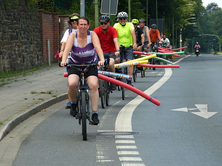 18 Teilnehmer haben am gestrigen Samstag an der ersten vom ADFC-Essen ausgerichteten „Poolnudel-Tour“ teilgenommen. Mit dieser durchaus ungewöhnlichen Aktion sollte auf die oftmals viel zu geringen Seitenabstände vorbeifahrender Autos aufmerksam gemacht werden. Bekanntlich müssen Autofahrer beim Überholen von Radfahrern einen Seitenabstand von mindestens 1,50 Metern einhalten, was aber gerade im innerstädtischen Verkehr nur selten der Fall ist. Besagter Mindestabstand ist aber ein elementarer Bestandteil für mehr Sicherheit beim Radverkehr. Um dies zu unterstreichen, werden die bunten Schwimmhilfen einfach quer auf den Gepäckträger geschnallt, um das Fahrrad optisch breiter wirken zu lassen.