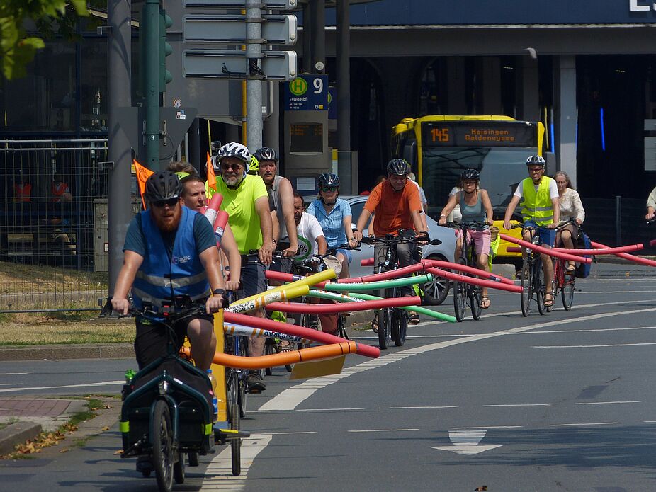 Mit den Poolnudeln ausgerüstet starteten die Radler auf eine etwa 15 Kilometer lange Rundtour durch die südlichen Stadtteile sowie rund um die Essener City. Und es hat auch wirklich funktioniert, viele Autofahrer hielten erstaunlich großen Seitenabstand zu der Radlergruppe. Auf schmaleren Straßen versuchte kein Autofahrer, sich wie sonst häufig erlebt dicht an den Radlern vorbei zu quetschen. Und selbst auf den oftmals viel zu schmalen Radstreifen fühlten sich die Teilnehmer dieses Mal sich sehr sicher, da ihnen kein Auto zu nahekam.