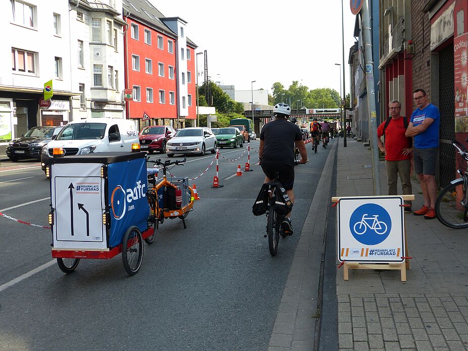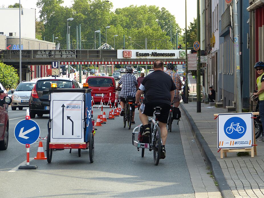Betroffen ist vor allem der Abschnitt zwischen Palmbuschweg und dem Altenessener Bahnhof, zu welchem es auch keinerlei Alternativführungen gibt. Die Radfahrer, die sich überhaupt auf dieser Hauptverkehrsstraße entlang trauen, weichen mitunter auf den ohnehin schon sehr schmalen Gehweg aus – alles in allem ein untragbarer Zustand. Bis zum Jahr 2035 möchte die Stadt den Anteil des Radverkehrs auf 25% steigern. Dem muss auch der Ausbau der dafür erforderlichen Infrastruktur entsprechend Rechnung zu tragen. Die zeitlich begrenzte Aktion am gestrigen Mittwoch mit der plakativen Umwidmung einer Autofahrspur zu einer „ProtectedBikeLane“ diente vor allem dazu, die Notwendigkeit derartiger geschützter Radfahrspuren nachhaltig zu untermauern.